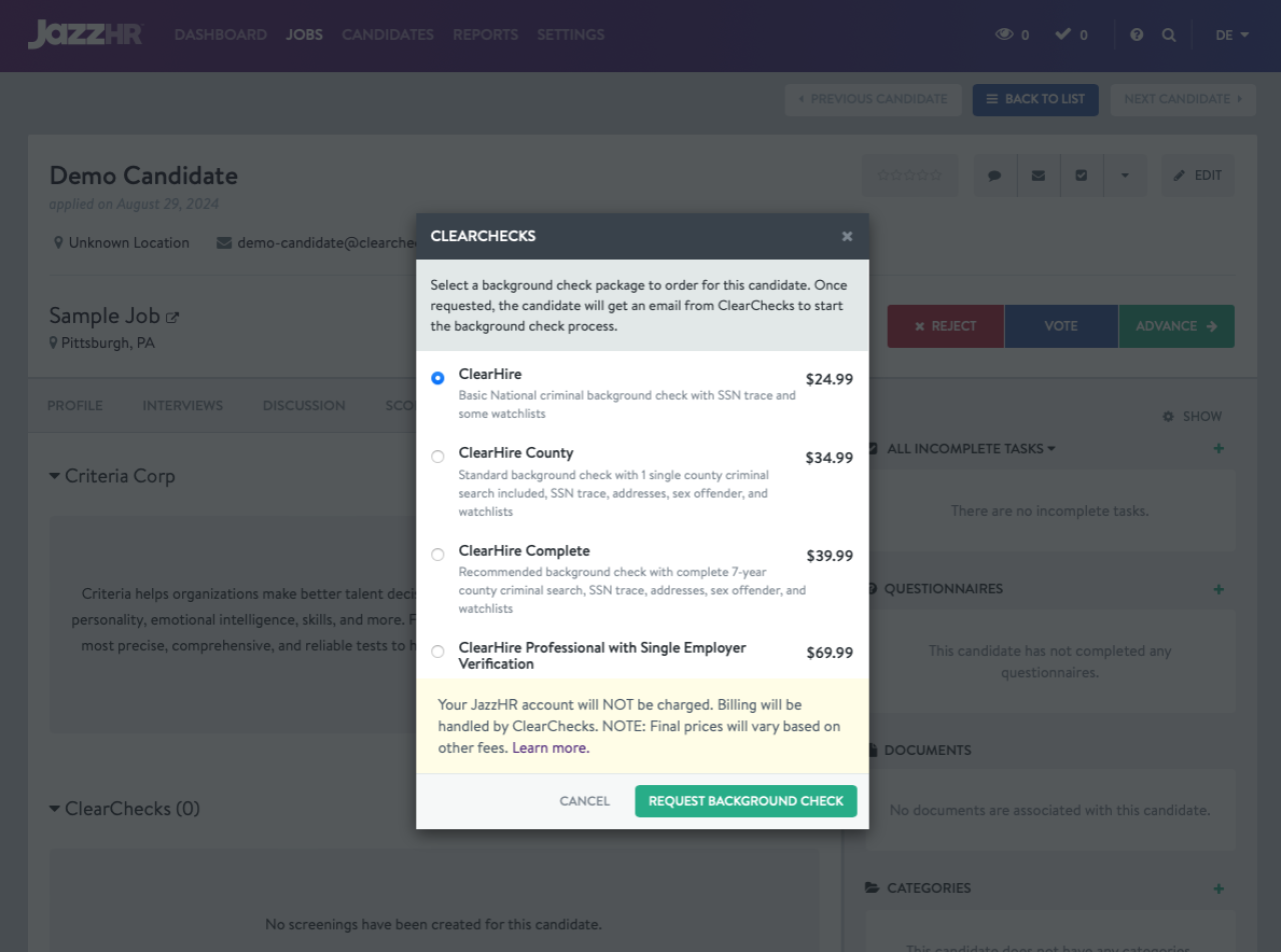 A popup will show the screening packages and pricing configured in your BackgroundChecks.com account