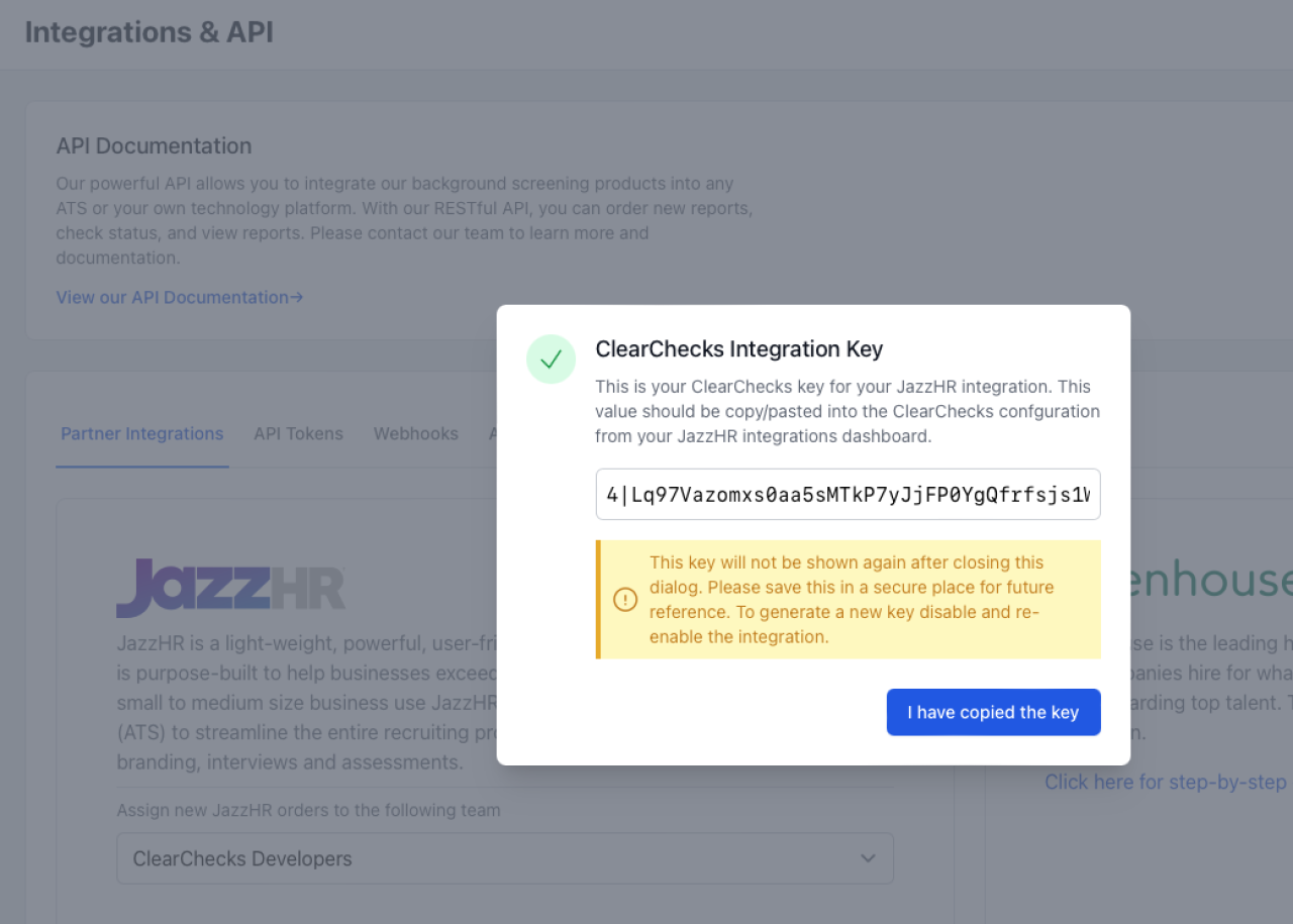 You will get a popup with an api key. Copy this API key to enter into JazzHR